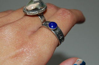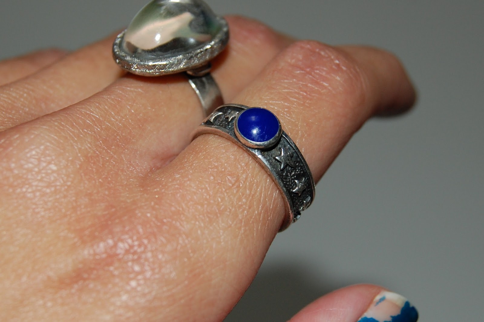 A year ago, I bought a tear shaped lapiz pendent. I wore it often with my clear lucite (shaped like a tear frozen in time) and my grandpa's tear shaped peace sign. Recently, I've lost track of the lapiz :( But I bought this gorgeous ring (below). I call it my "night ring." Lapiz looks like a clear night sky. Some lapiz stones even have a metallic gold matrix of sorts, like streams of stars. The stars on the band complement the stone so nicely.