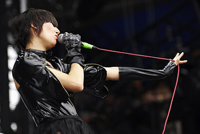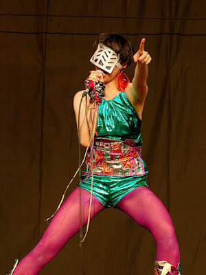When I was twelve years old I asked my dad to take me to see the Yeah Yeah Yeahs. Sadly, plans for that fell through but I was still enamored with Karen O. Sometimes she looked like she let a kindergarden class fingerpaint her clothes and wore them like they were made for the stage. (I later learned that much of her on stage threads were the work of Christian Joy, I'll cover her in another post.)Her ripped tights and tight, tapered leg pants (amongst the era of the bootcut) held their own during her on stage acrobatics. This resulted in her looking like a superhero. At a performace on David Letterman she moved like a marionette or as if she was transfixed on vital points of the universe. Through the years I've continued to regard the Yeah Yeah Yeahs as one of the best and Karen O still reigns as an icon in my mind.